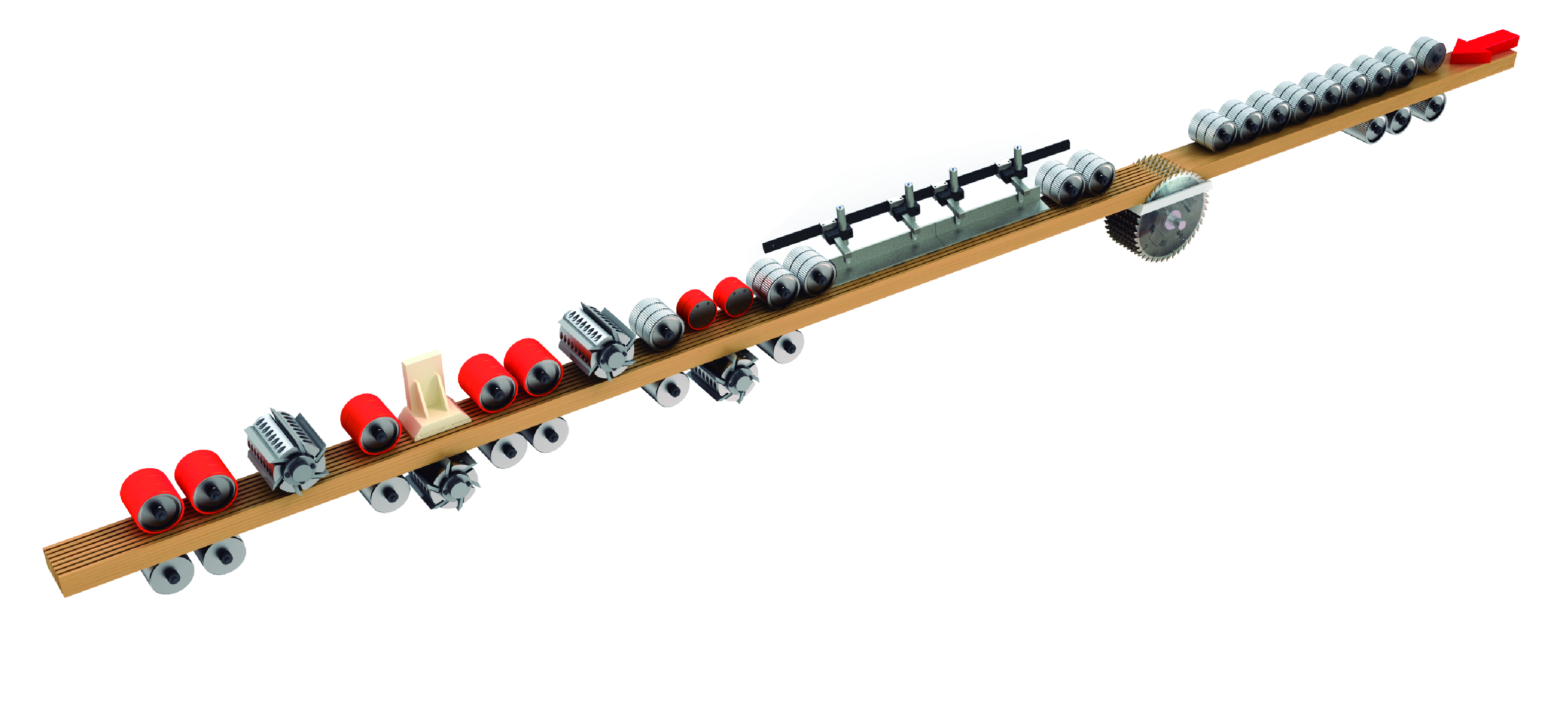 Prensores de entrada de alta capacidad de empuje para una mejor compresión en la madera y con sistema de guías lineales para mejorar la posición de estos acompañados con el tupi en su posicionamiento automático.