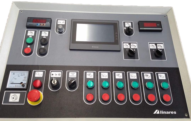 Tablero de mando a distancia, con diferentes funciones como indicador de velocidad, metros de madera que procesa la máquina, touchscreen con diferentes funciones como alerta sobre funciones y errores de la máquina, configuración de tiempo de lubricación y de mantenimiento, entre otros.